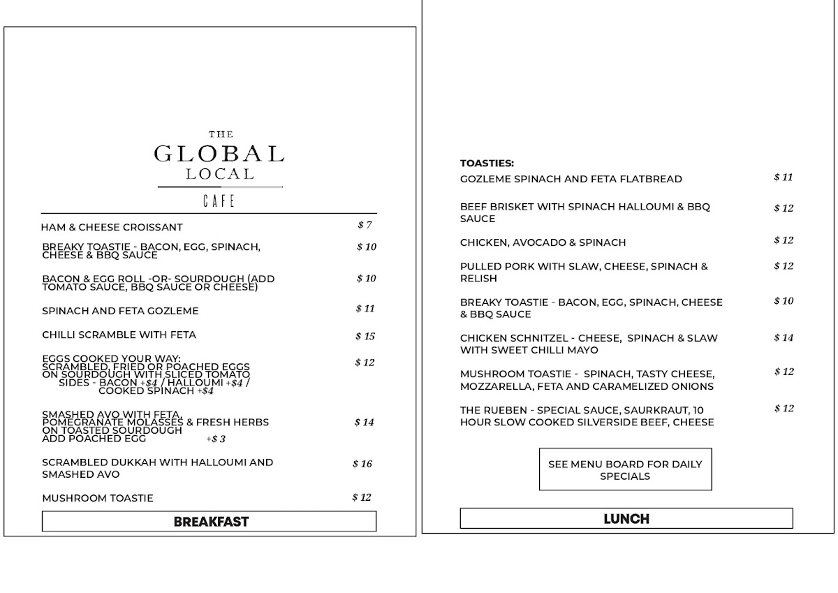 The Global Local's menu is a delectable array of options that cater to both hearty appetites and light snacks. Their coffee selection is truly outstanding, featuring various brews from classic lattes and cappuccinos to intriguing options like the Chai Latte and Mocha. The café isn't just about drinks; it boasts a remarkable array of breakfast and lunch dishes that are sure to please any palate. Think of savoring the robust flavors of the Beef Brisket with Spinach, Halloumi & BBQ Sauce or delighting in the Gozleme with Spinach and Feta Flatbread— both are sure to tickle your taste buds and leave you craving more. Vegetarian options like the sumptuous Mushroom Toastie also shine, ensuring everyone finds something to enjoy.
